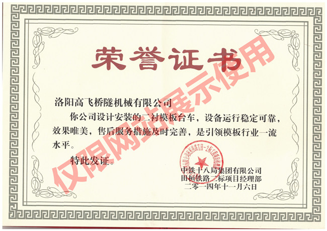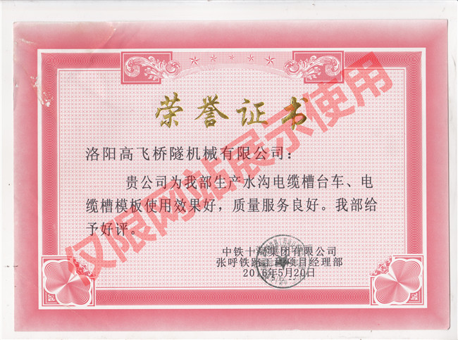 田恒鐵路項目榮譽證書