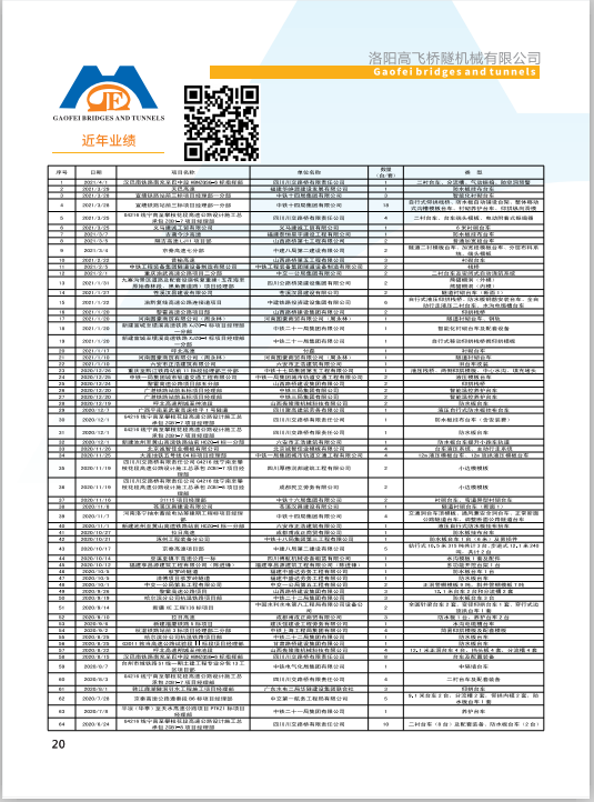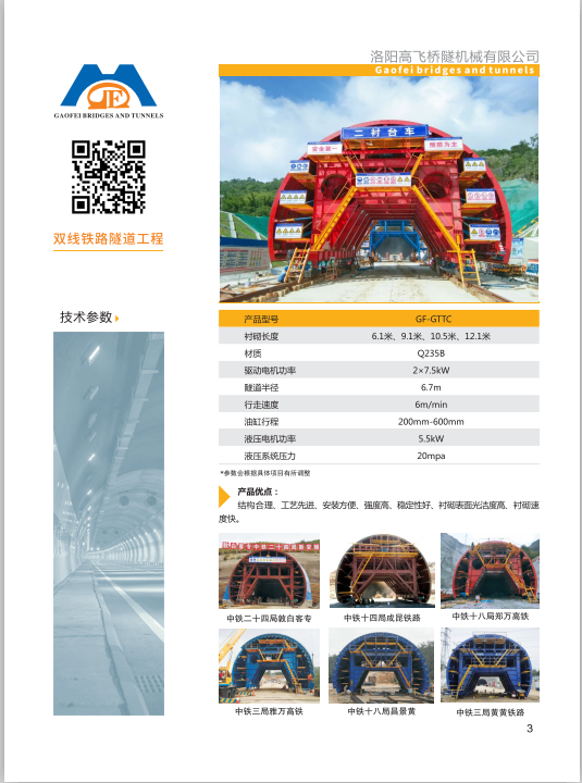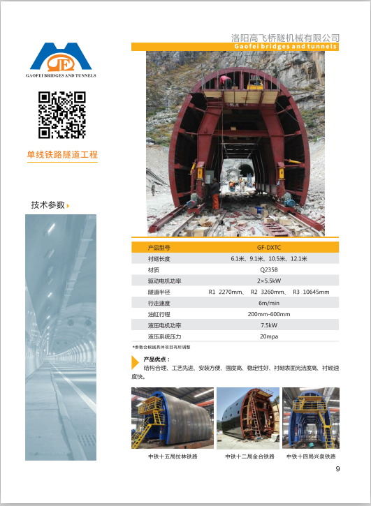 高飛公司多年來專注于軍工項(xiàng)目工程、鐵路工程(含客運(yùn)專線)、公路工程、城市軌道交通、水利水電工程、市政工程等施工項(xiàng)目的隧道、橋梁等多個(gè)領(lǐng)域,并可根據(jù)客戶需要設(shè)計(jì)、制造、異型定制等專需產(chǎn)品,先后和中國(guó)中鐵、中國(guó)鐵建、中國(guó)電建、中國(guó)交建、中國(guó)水利水電、中鐵裝備、中治集團(tuán)、葛洲壩集團(tuán)等成為戰(zhàn)略合作伙伴。