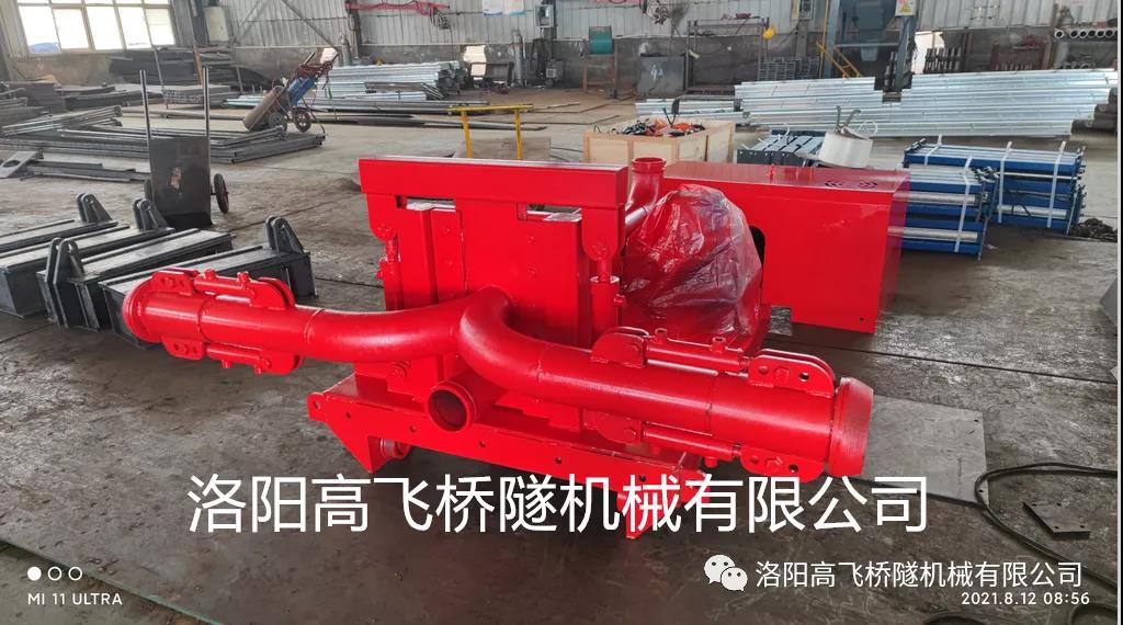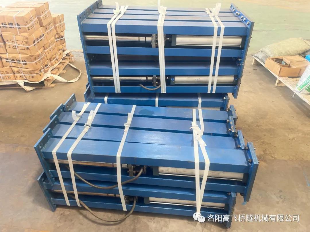 臺車配置一套混凝土分層澆筑布料系統,實現了混凝土逐窗分層澆筑,設備可實現兩側和拱頂布料,每層四個入料點,進一步提高襯砌施工效率和質量。臺車布料系統不需要人工拆管、接管、換管和清洗,僅需一名操作人員輕松操作遙控器,即可實現分層逐窗澆筑。
