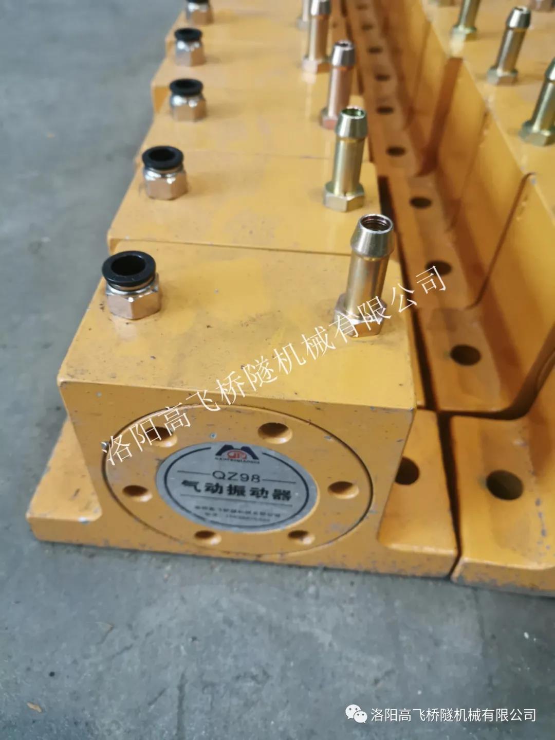 臺車配置8個插入式和32個附著式高頻自動振搗系統,通過高壓氣體帶動高頻氣動振搗器工作,作業人員可通過PLC 程序控制持續振搗時間、間隔時間、振動次數。拱部插入式振搗系統通過插入式高頻振動器的往復運動,對拱部混凝土深部進行充分振搗,實現環向、縱向及厚度方向的振搗全覆蓋,有效提升混凝土強度和密實度,可以從根本上解決隧道拱頂混凝土不密實導致脫空和空洞的難題。高頻氣動振動器,振動范圍廣、深度大,使混凝土振搗密實,整體提升隧道襯砌外觀質量。